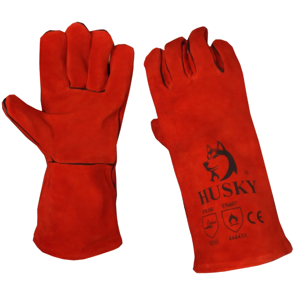 Rękawice spawalnicze wykonane z dwoiny bydlęcej w kolorze czerwonym.