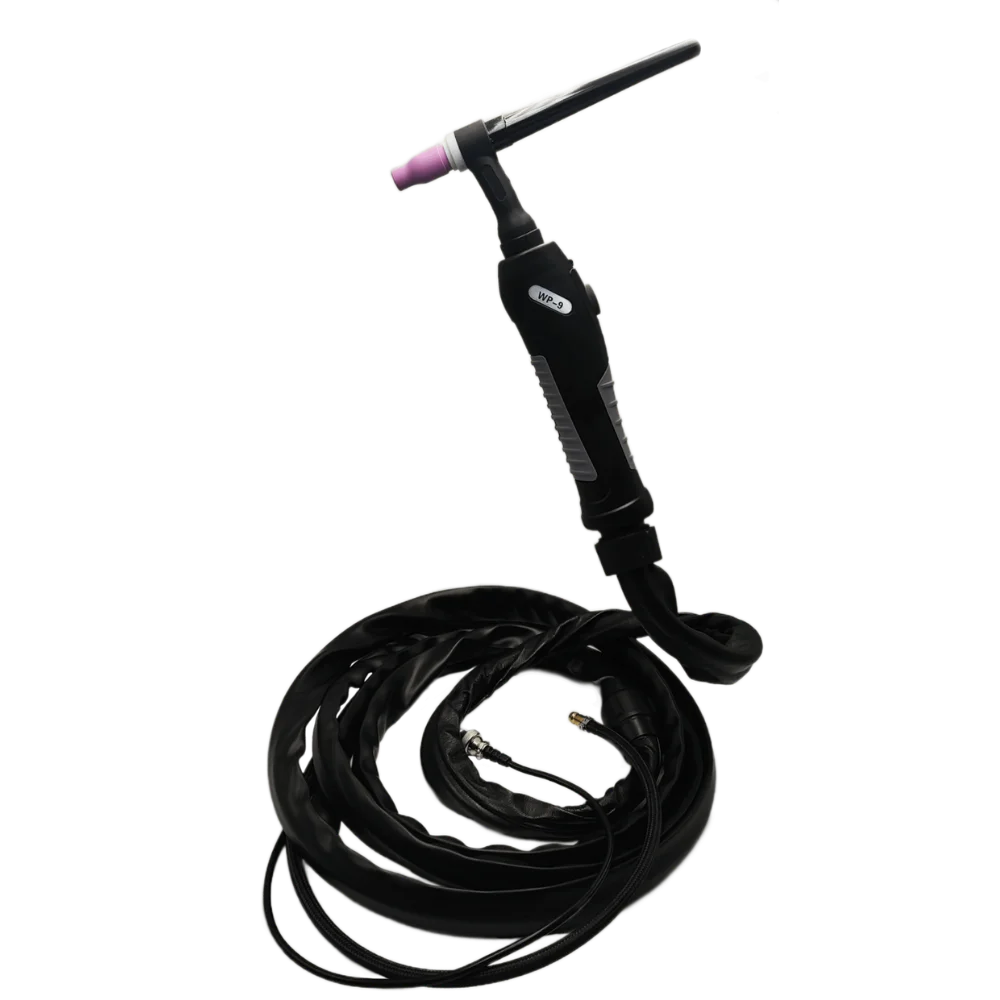 Uchwyt spawalniczy T-9 chłodzony gazem do spawania metodą TIG (elektrodą nietopliwą). Przyłącze prądowe wyposażone jest we wtyk typu DINSE wraz z wtykiem szybkozłącza gazowego. Przewody sterownicze nie posiadają wtyczek sterujących.